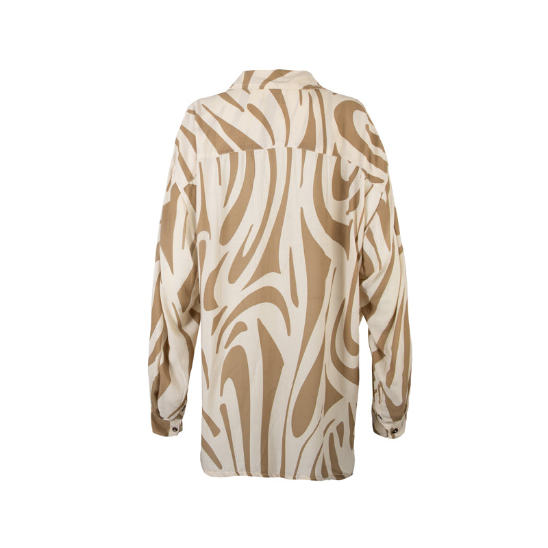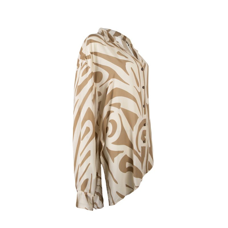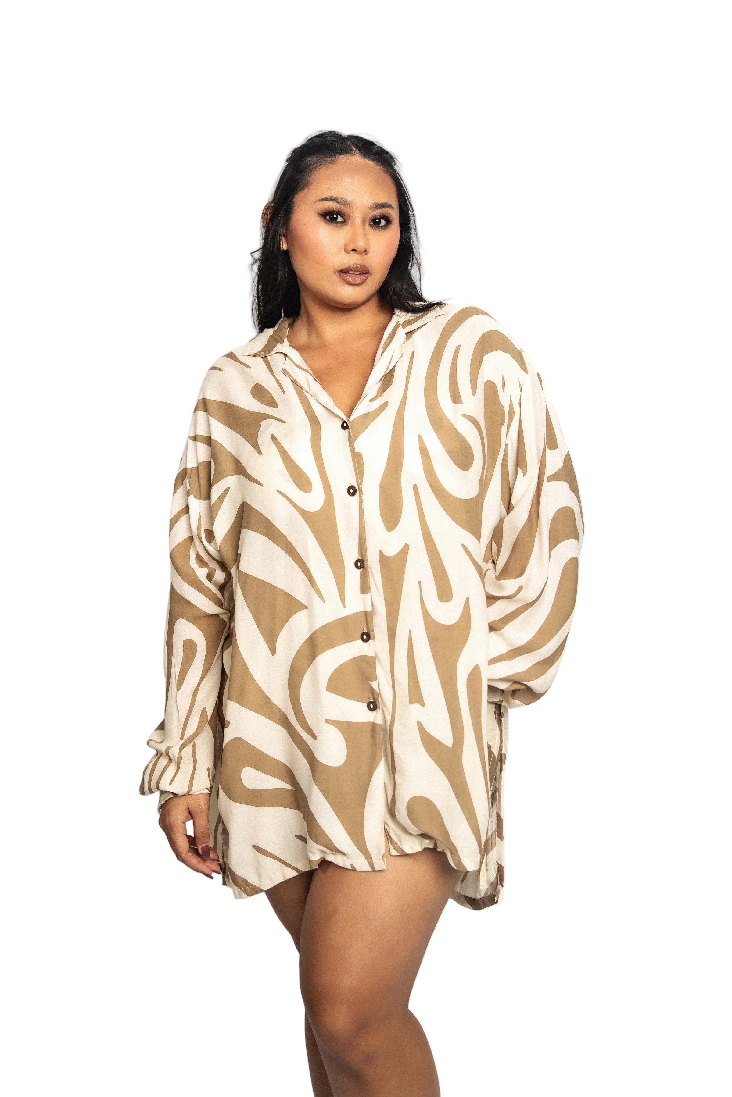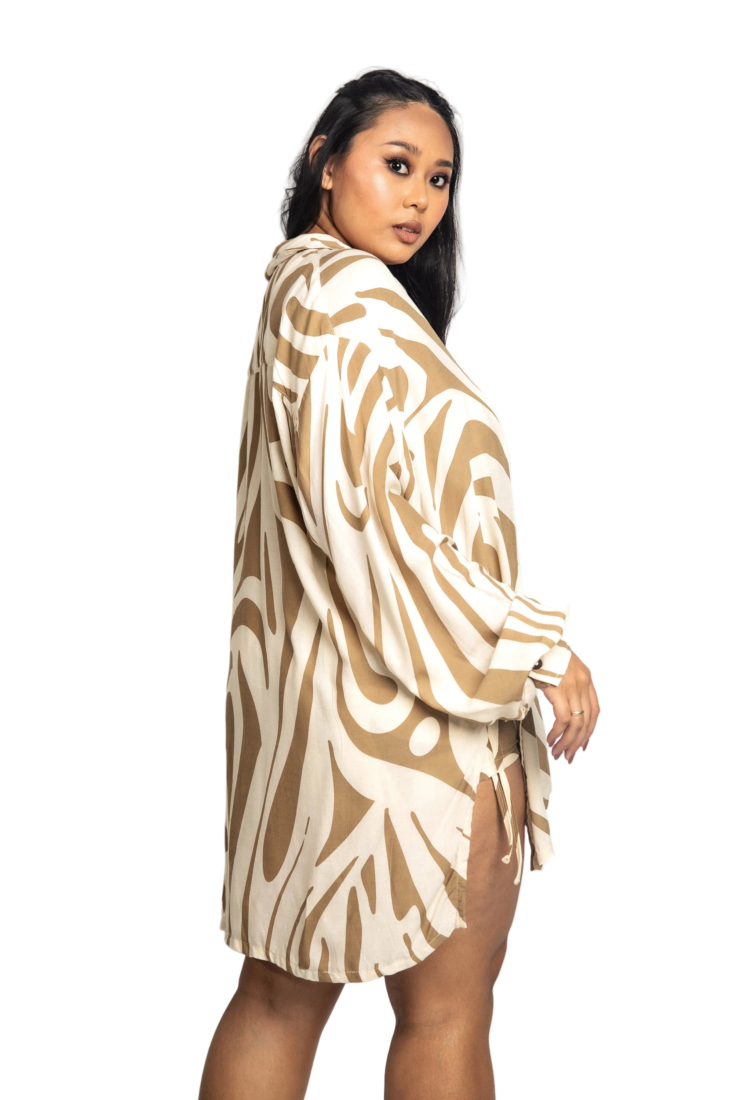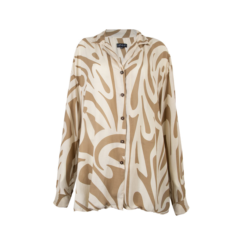 Our new Cream & Camel, Forest print, long-sleeved shirt is created from original Bam-Bam illustrations that are screen-printed onto high-quality textiles. A light and soft rayon voil fabric, this shirt is perfect for elevating any look for summer freshness. The front of the shirt can be tied up or left loose depending on the look. Make your statement at your event, party or enjoy a casual afternoon.