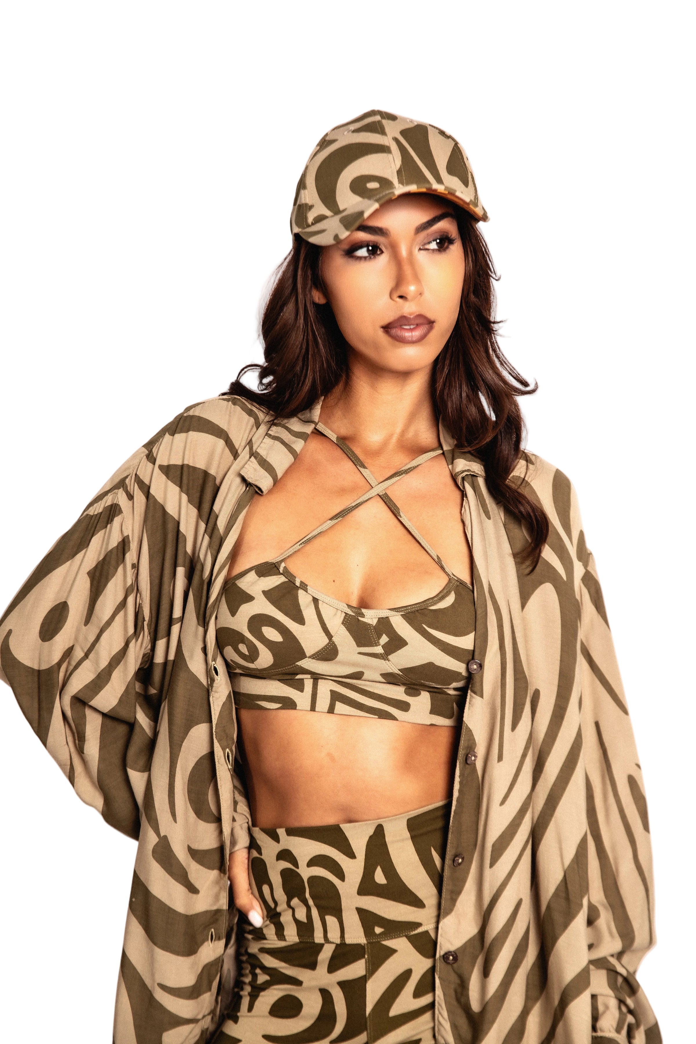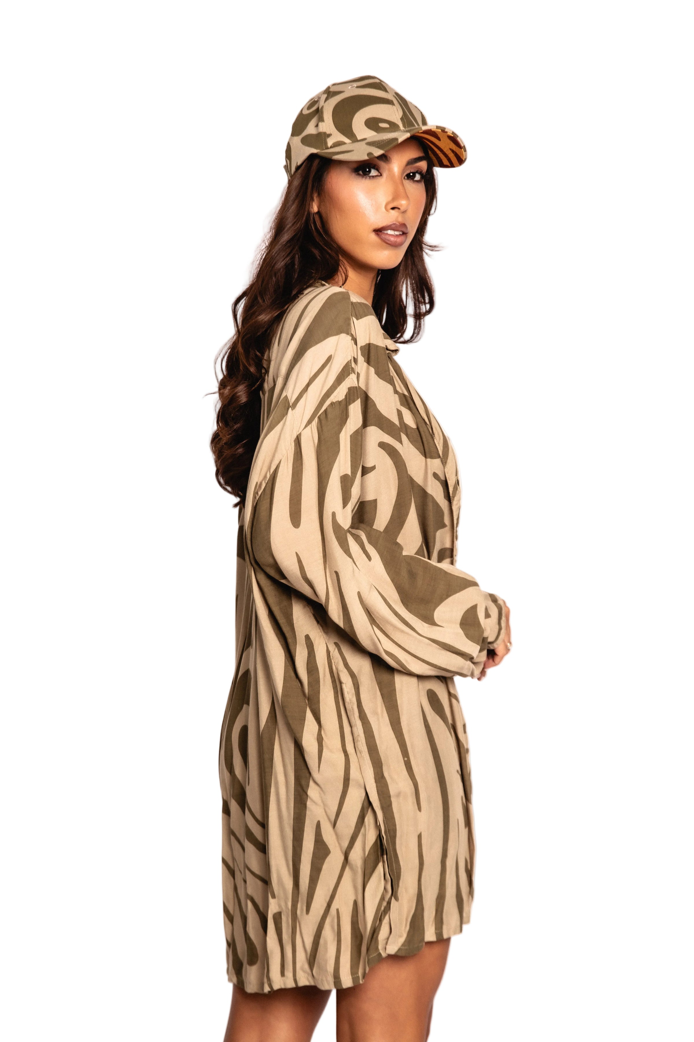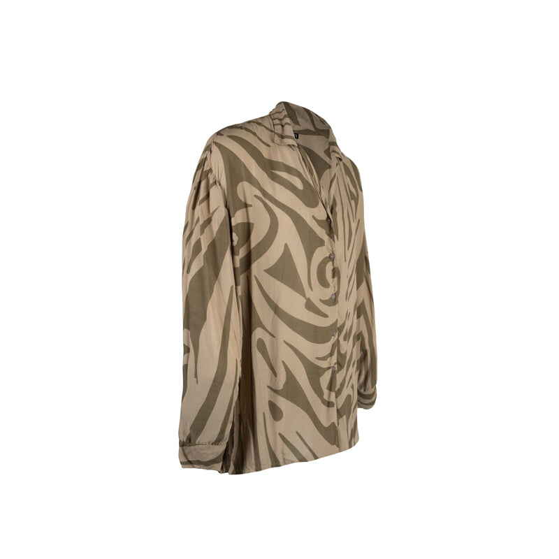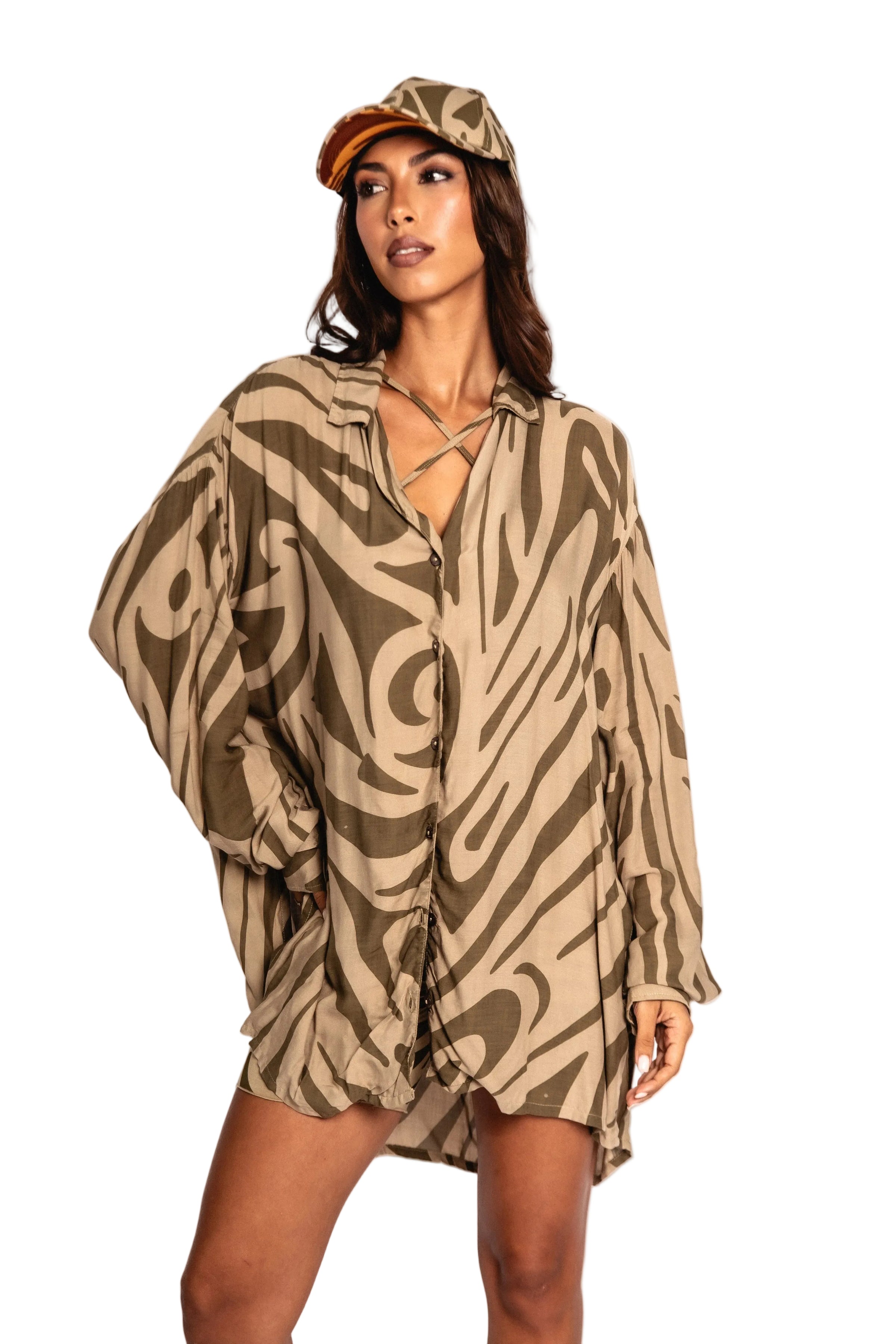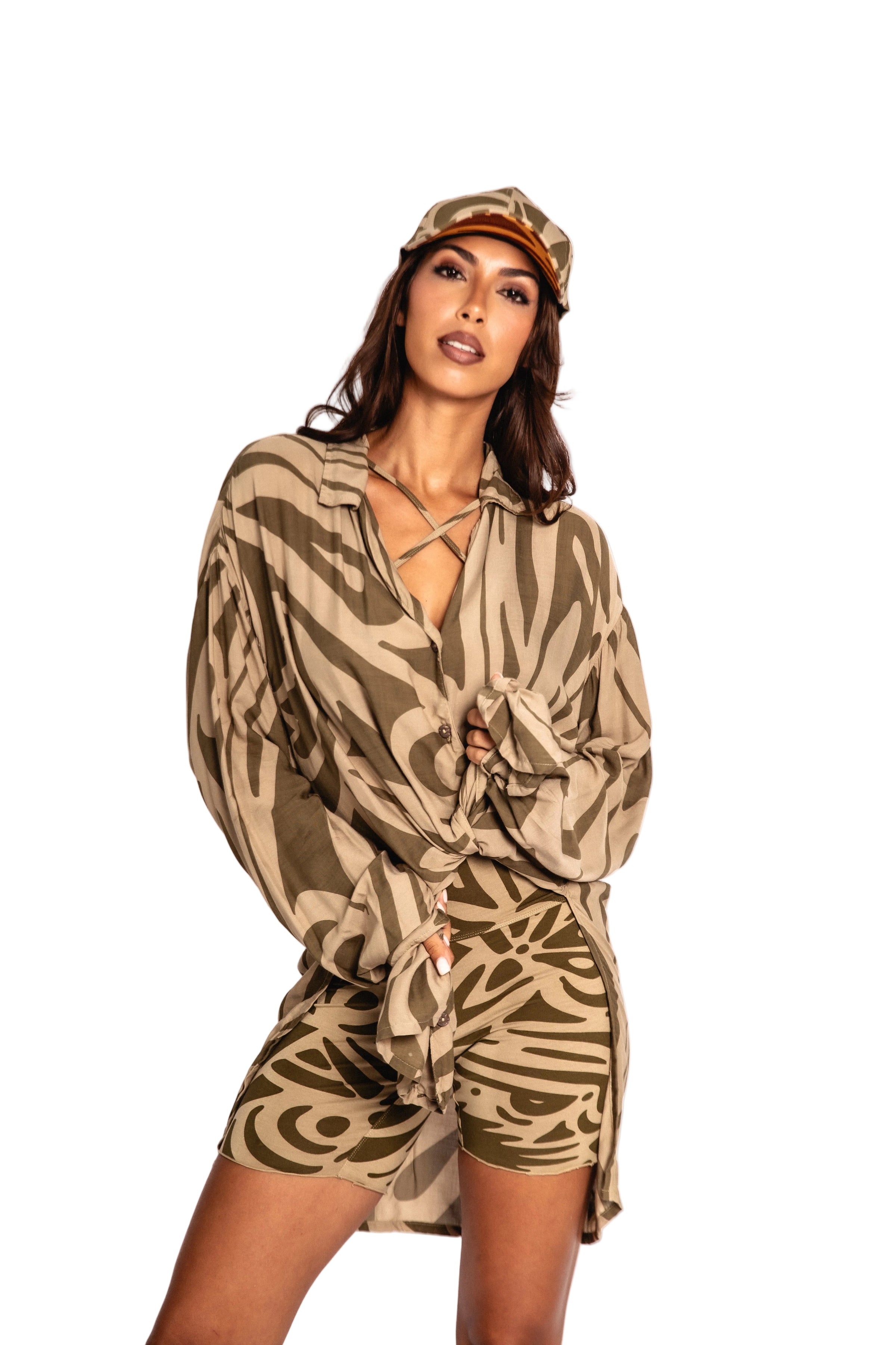 Our new Sage & Olive, Jungle print, Long-sleeved shirt is created from original Bam-Bam illustrations that are screen-printed onto high-quality textiles. A light and soft rayon voile fabric, this shirt is perfect for elevating any look for summer freshness. The front of the shirt can be tied up or left loose, depending on the look. Make your statement at your event, party, or enjoy a casual afternoon.