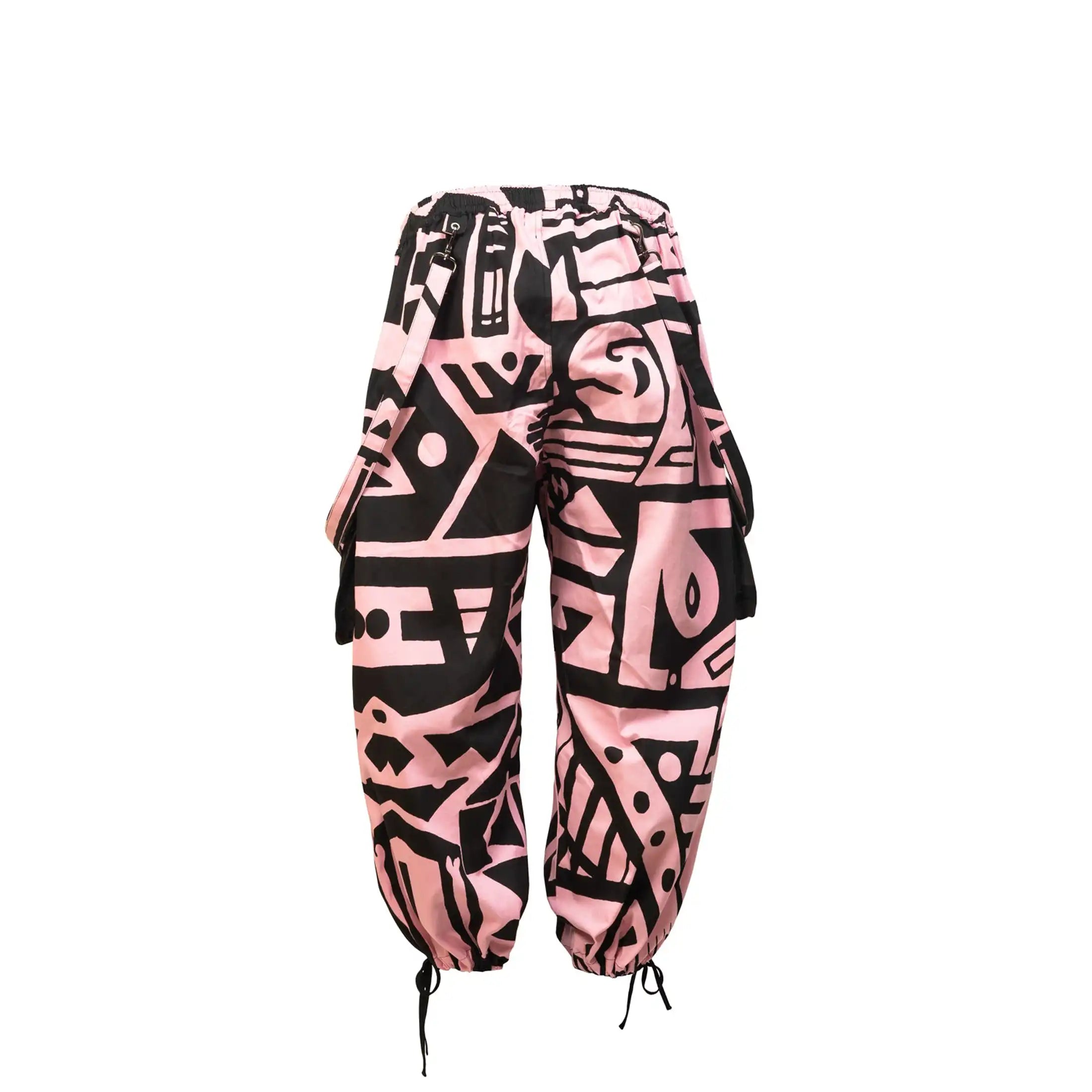 Our Pink & Black Bagus Pants are created from original Bam-Bam illustrations that are screen-printed onto cotton twill fabric, that is strong and robust with a slight stretch, similar to a light denim. These trousers have a relaxed baggy fit perfect for lounging and dancing, with adjustable shoulder straps that can be added and removed with simple 'lobster claw' metal clasps. Featuring hidden side pockets, an adjustable draw-string waist and adjustable draw-string ankle cuffs. They also have X2 large side pockets, charcoal colour, with plenty of space and buttons to keep your belongings safe! So you have less to carry to the rave! Add these trousers to your casual or streetwear wardrobe. Each pair is from a different part of the fabric so each piece is a unique design.
