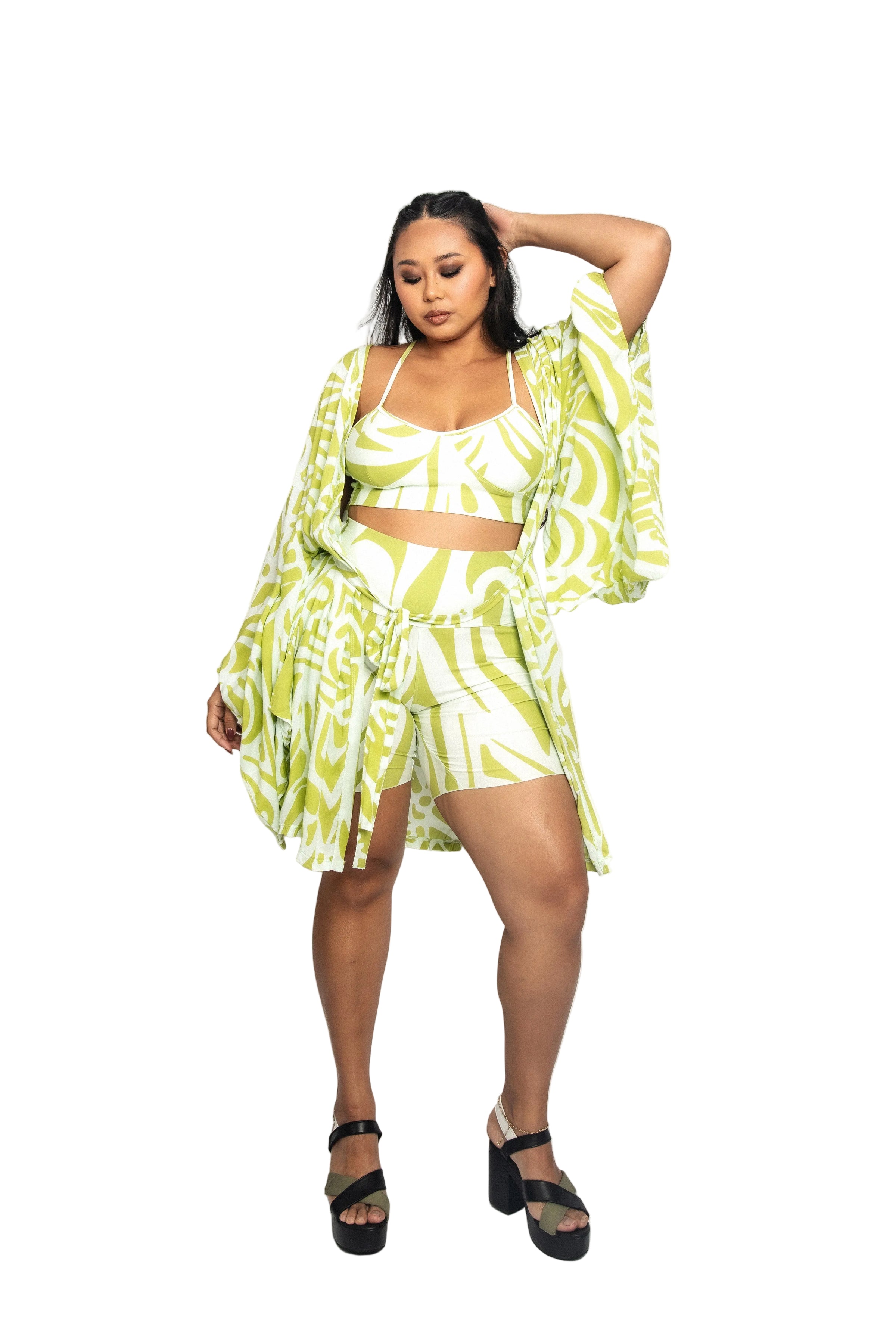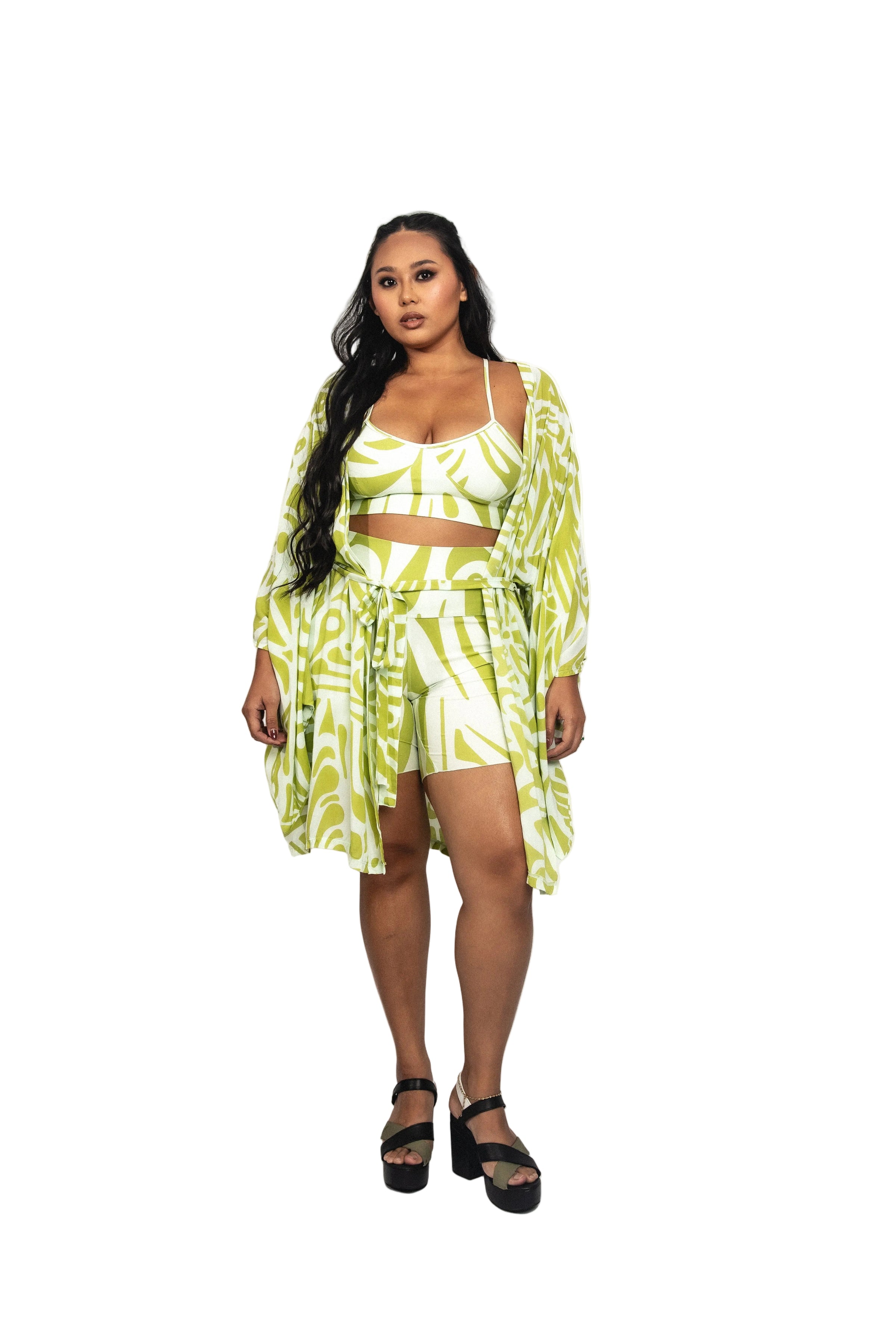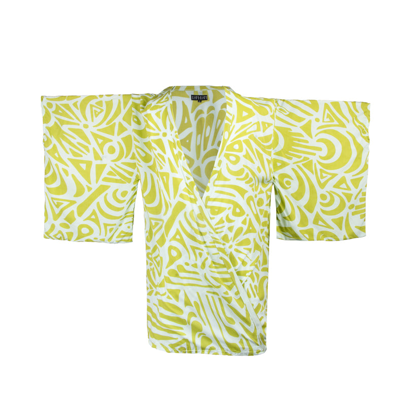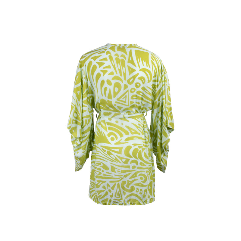 Our new Grass & Pastel Green, jungle print Kimono is created from original Bam-Bam illustrations that are screen-printed onto high-quality textiles. This silky, light and classy Kimono is the perfect versatile addition to any creative wardrobe— perfect for parties, streetwear, beach vibes and poolside. This lightweight and super soft rayon voil fabric is perfect for floating into any event. The Bam-Bam Kimono offers both style and practicality, with hidden side pockets and a sash to fasten it.